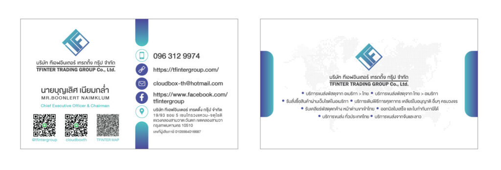 ผมนายบุญเลิศ เนียมกล่ำ เป็นผู้ก่อตั้ง TFINTER GROUP ซึ่งแต่ก่อนเราเคยใช้ชื่อว่า GadgetD Service สาเหตุที่เราเปลี่ยนชื่อเนื่องมาจาก เราได้ยกเลิก Product Service บางตัวไป และได้ชุดทีมบริหารมาร่วมงานกับเราเป็นจำนวนที่มากขึ้น นั้นคือสาเหตุที่เราเปลี่ยนชื่อมาใช้ TFINTER GROUP เพราะต้องต้องขยายธุระกิจของเราให้กว้างขึ้น ไกลขึ้น คมขึ้น และที่สำคัญ ต้องถูกต้อง และแม่นยำ ปัจจุบันเราให้บริการด้านเงินนำเข้า เคลียร์ภาษี และรวมไปถึงด้านใบอนุญาต ต่างๆ ซึ่งเราดำเนินธุระกิจนี้มาเกิน 10 ปี ดังนั้นเรามุ่งมั่น และเราหวังเป็นอย่างยิ่งว่าการสั่งสินค้าต่างประเทศ จะเป็นเรื่องที่ง่ายสำหรับลุกค้าทุกท่าน เราหวังอย่างยิ่งว่าลูกค้าทุกท่านจะได้รับความสะดวกสบาย ปลอดภัย แม่นยำ และรวดเร็ว เราต้องขอขอบคุณทีมงาน GadgetD Service และ TFINTER GROUP รวมไปถึงลูกค้าทุกๆ ท่าน และสำคัญที่สุดที่เราขาดไปไมไ่ด้คือ ผู้มีพระคุณต่อ TFINTER GROUP ครับผม
